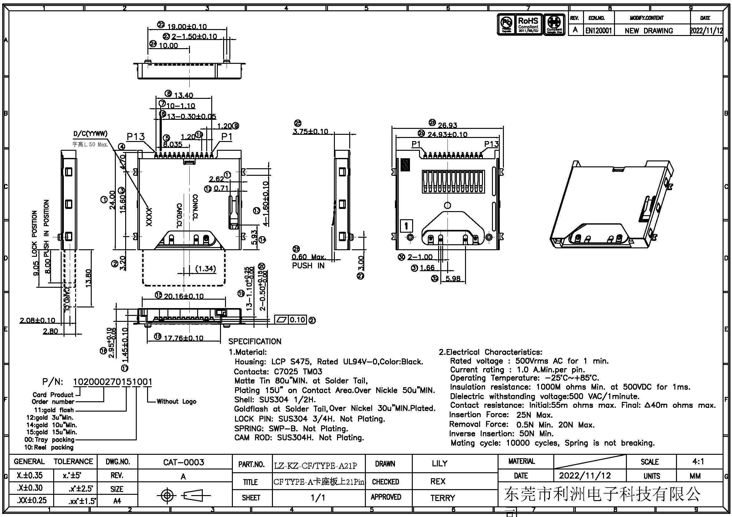 Contact resistance: Initial:55m ohms max. Final:△40m ohms max