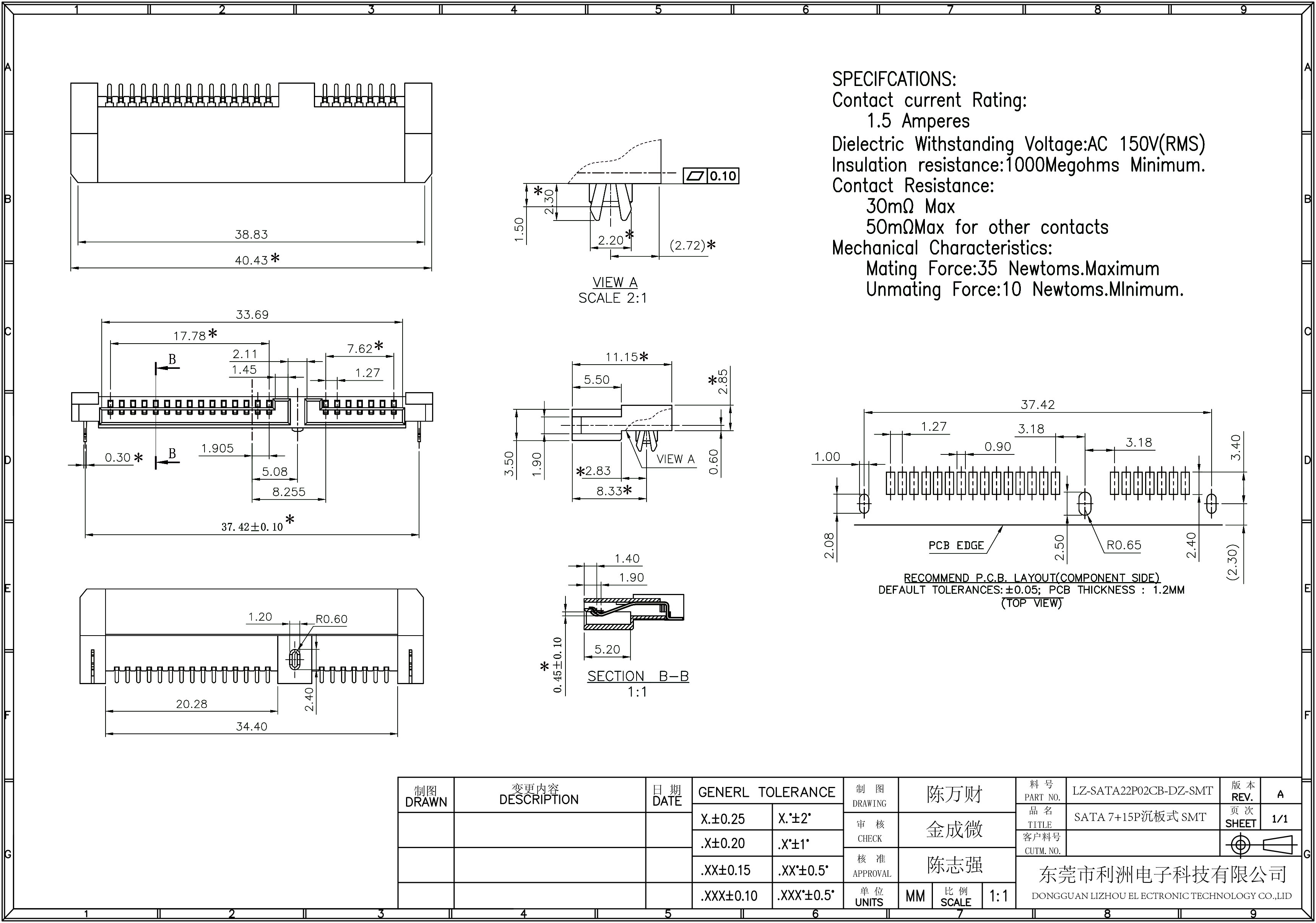 SATA7+15P沉板式SMT板上高度2.85