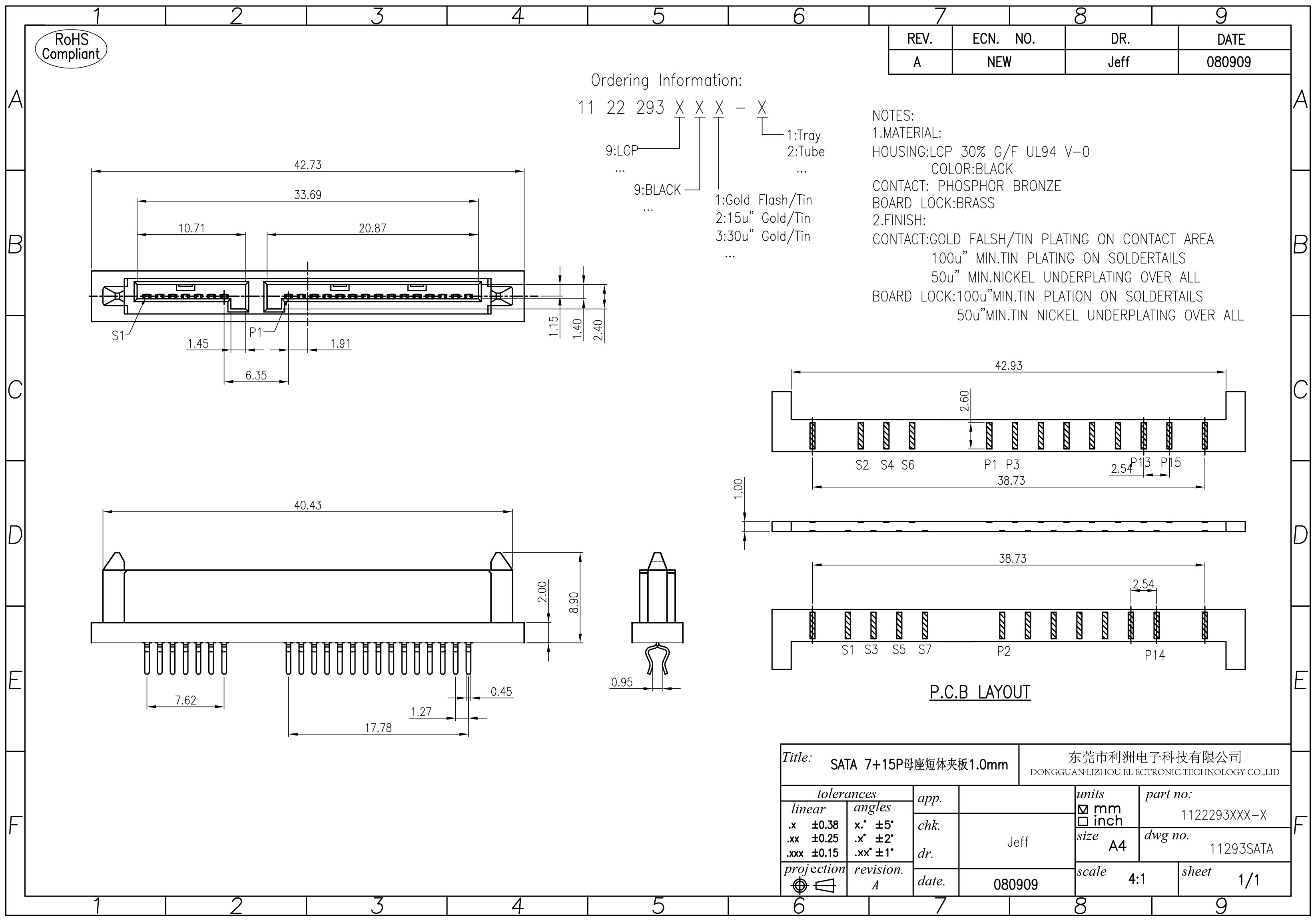Finish Contact: 15u“gold/tin plating on contact area,100u” min tin-lead plating on soldertails,50u“ min nickel underplating overall