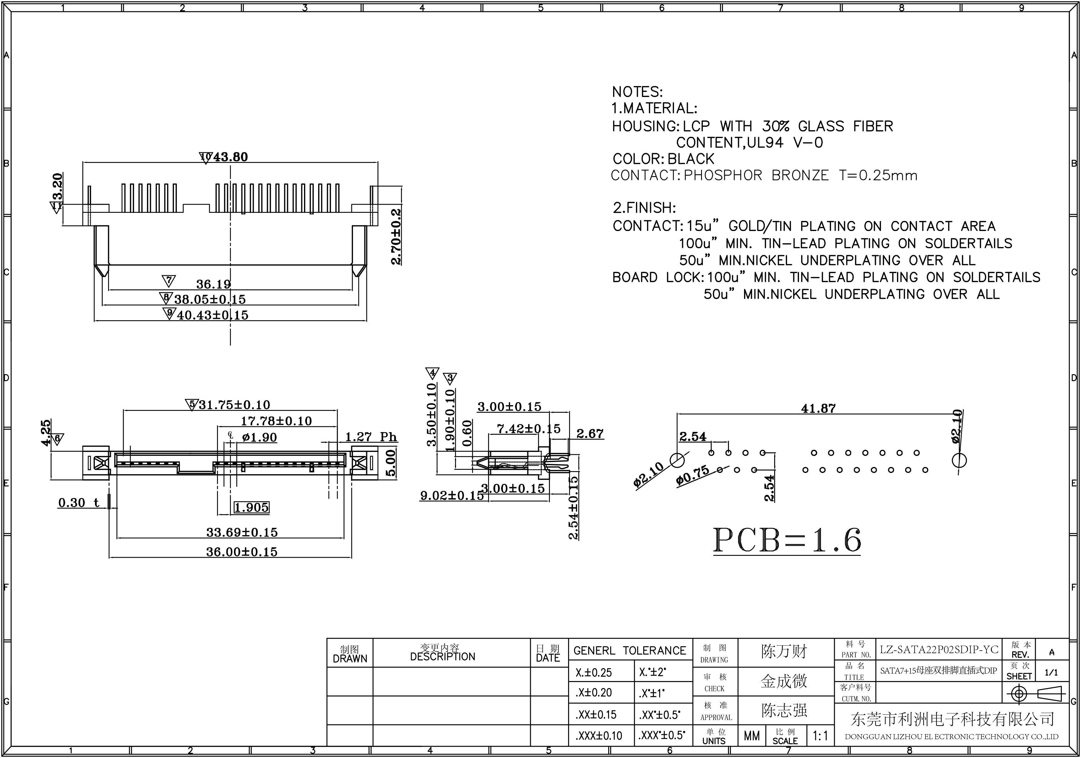 Finish Contact: 15u“ gold/tin plating on contact area 100u”min tin-lead plating on soldertails 50u“min nickel underplating over all