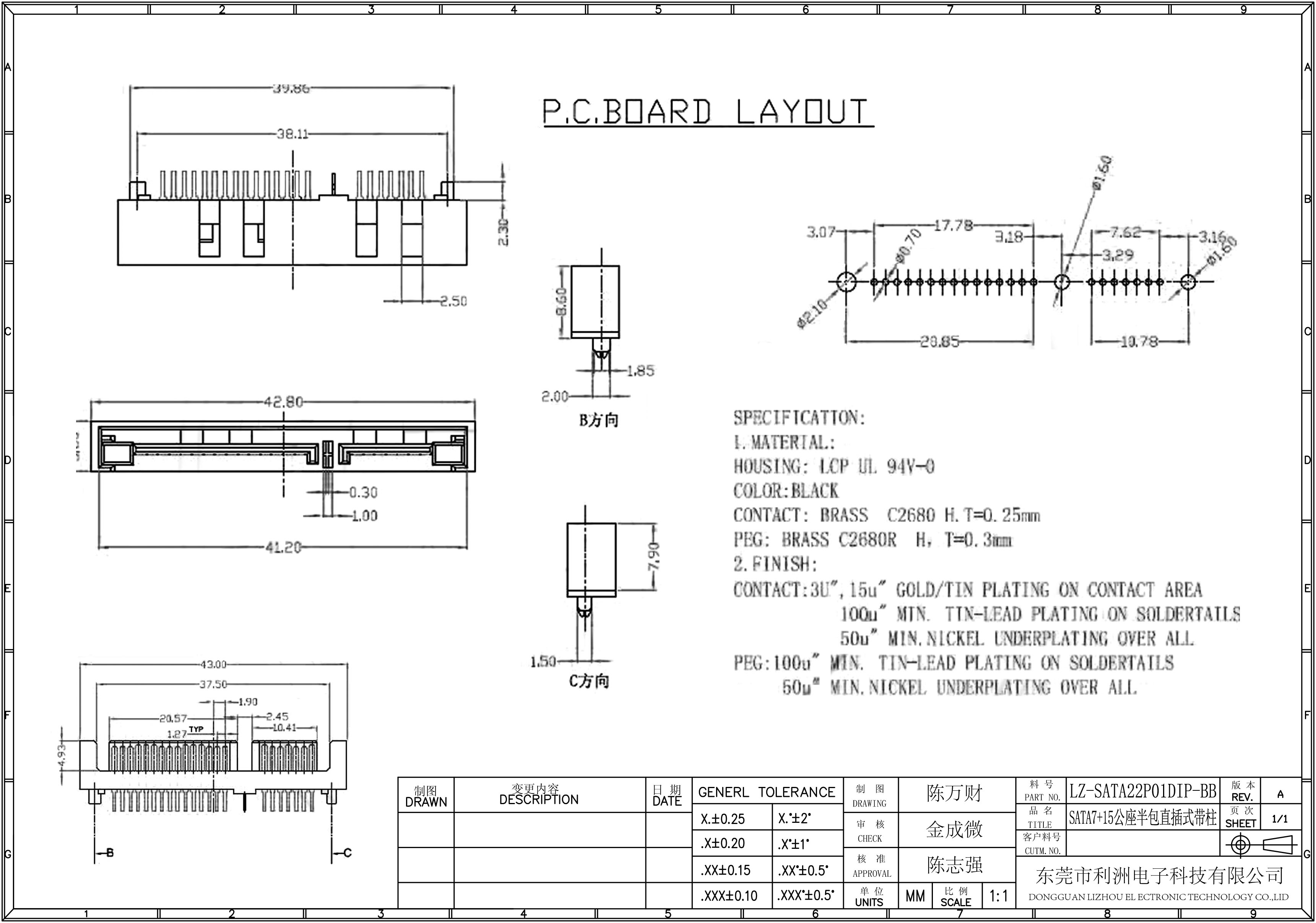 Finish Contact:  15u“ gold/tin plating on contact area 100u”min tin-lead plating on soldertails 50u“min nickel underplating over all