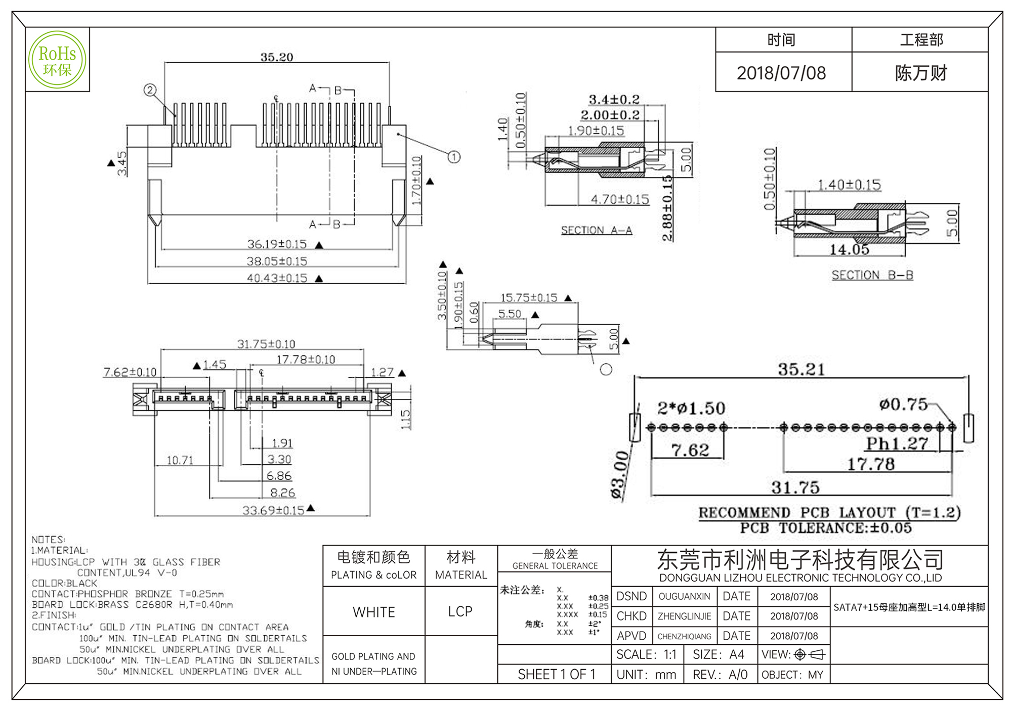 Finish Contact: 1u“ gold/tin plating on contact area 100u” min tin-lead plating on soldertails 50u”min nickel underplating over all