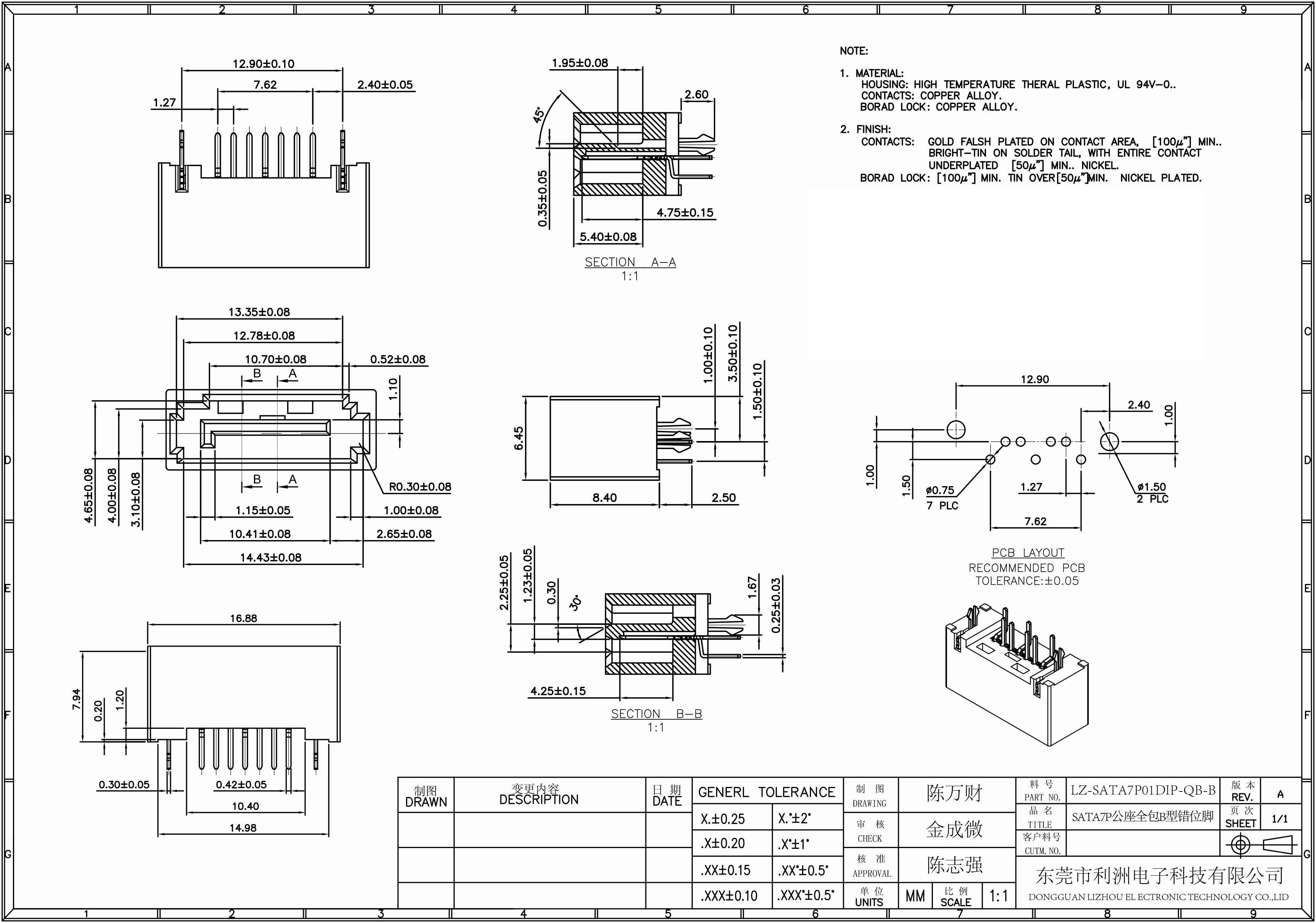 Finish Contacts: gold falsh plated on contact area,[100u"]min Bright-tin on sold tail entire contact underplated [50u"]min nickel