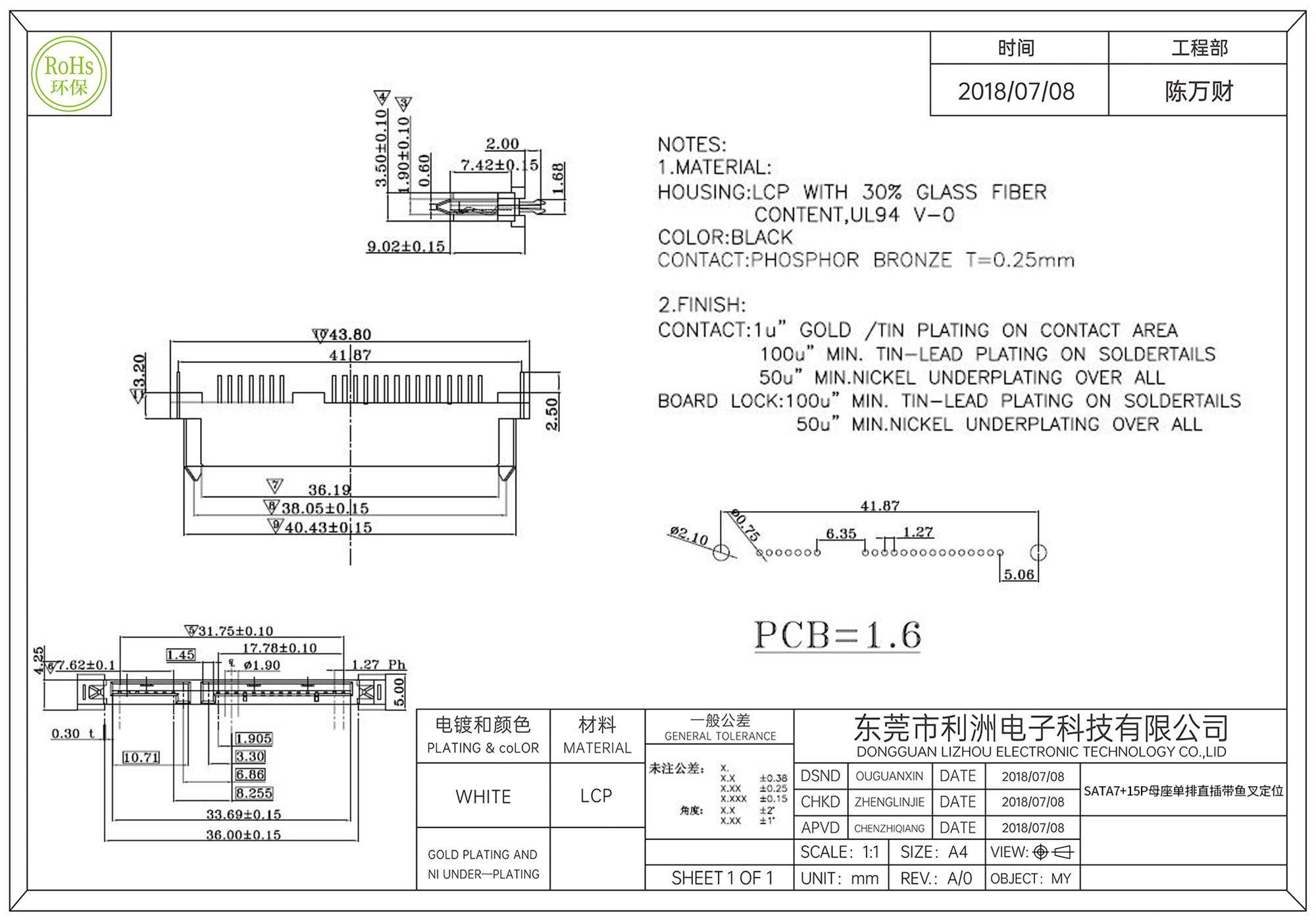 Finish Contacts: 1u" gold/tin plating on contact area 100u" min tin-lead plating on soldertail 50u" min nickel underplating over all