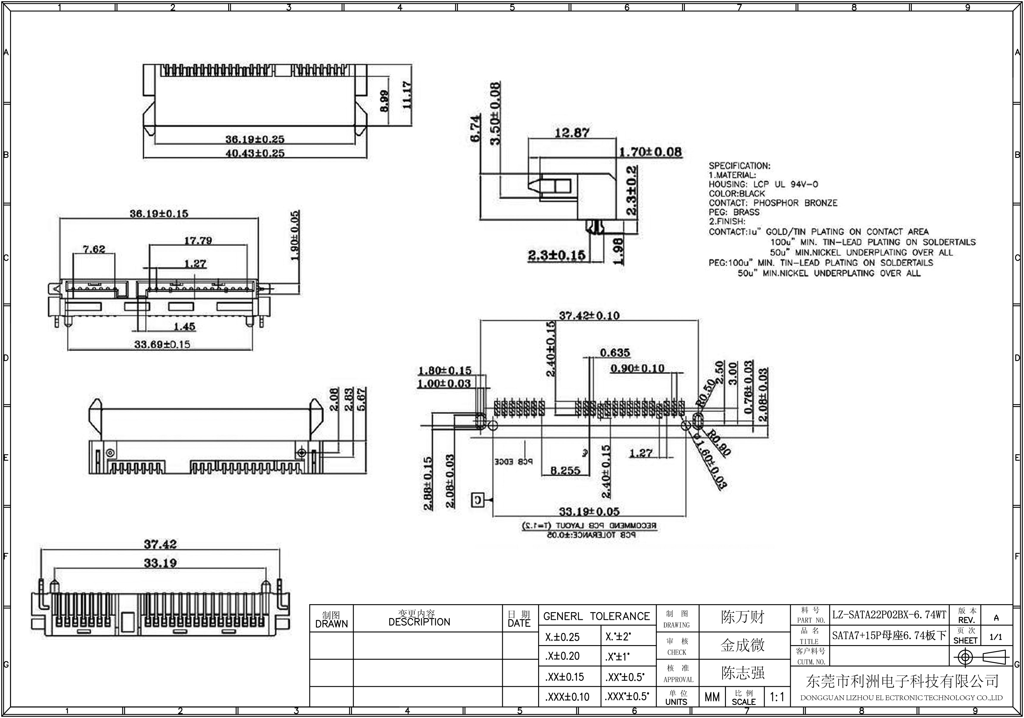 SATA7+15P母座6.74板下SMT