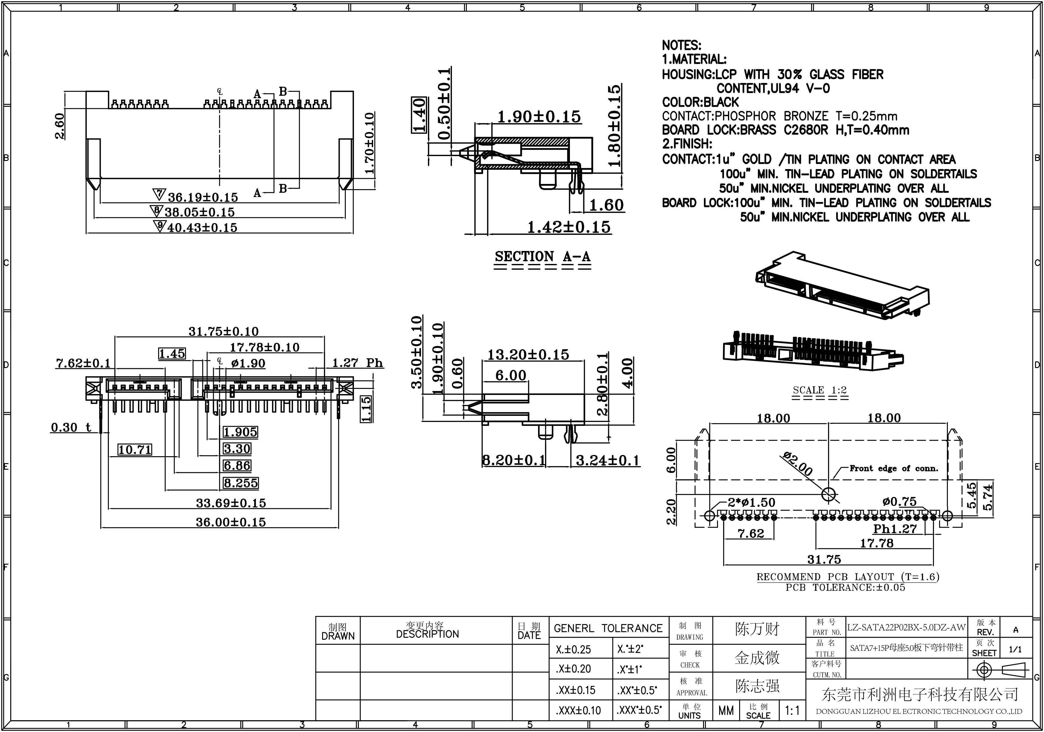 Finish Contact: 1u" gold/tin plating on contact area 100u" min tin-lead plating on soldertails 50u" min nickel underplating over all