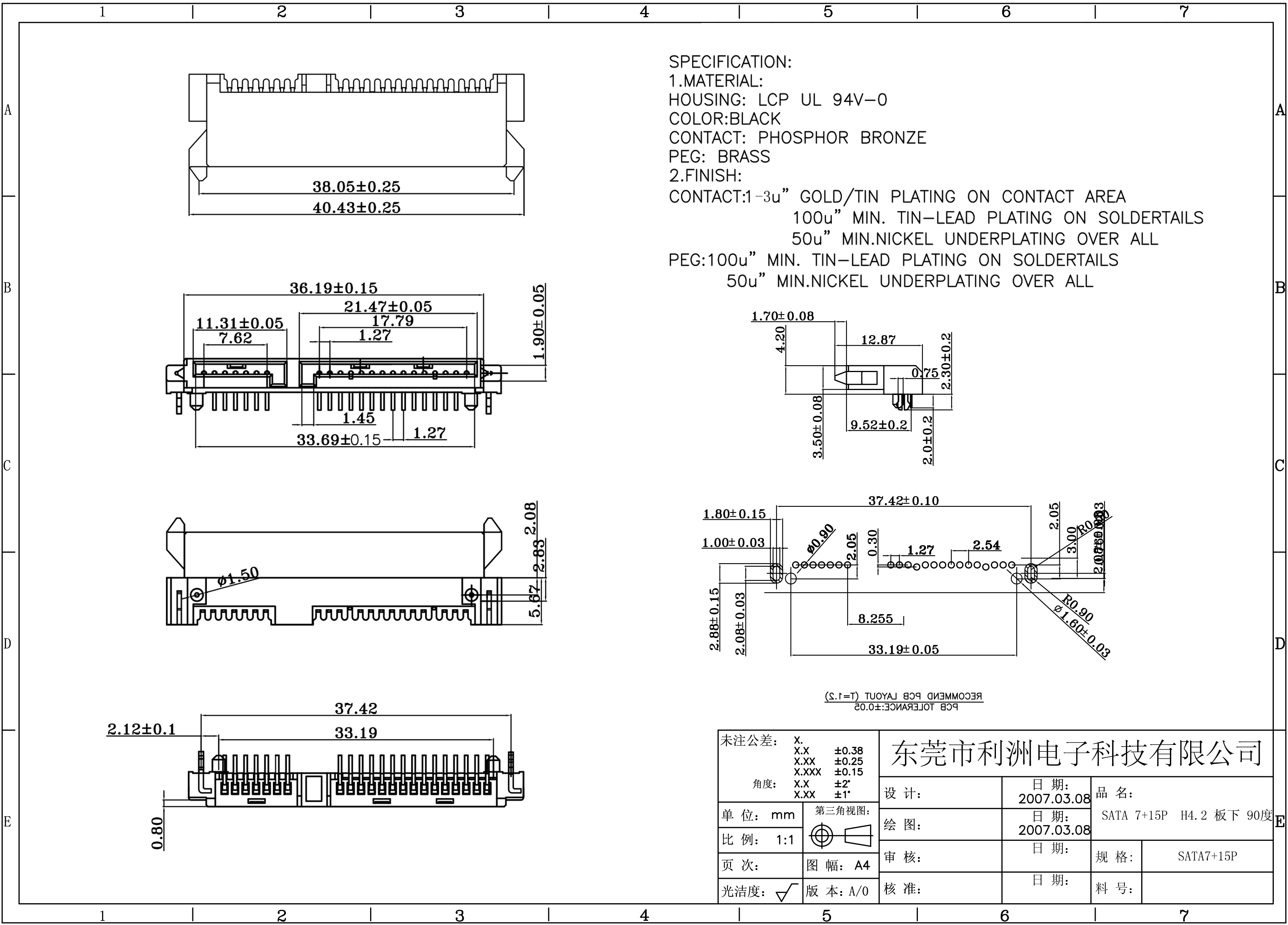 Finish Contact: 1-3u" gold/tin plating on contact area 100u" min tin-lead plating on soldertails 50u" min nickel underplating over all