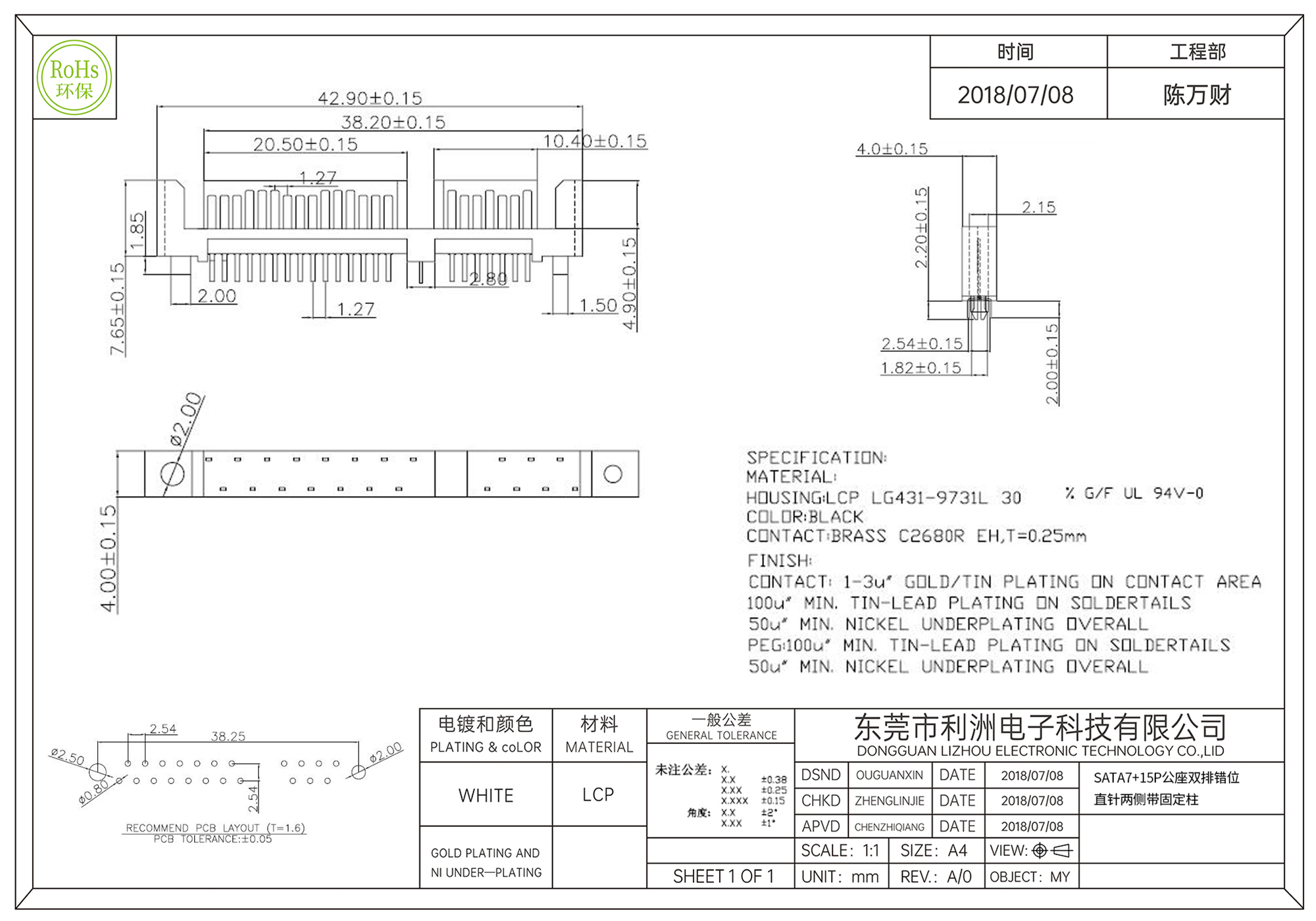 Finish Contacts: 1-3u" gold/tin plating on contact area 100u" min tin-lead plating on soldertails 50u" min nickel underplating over all