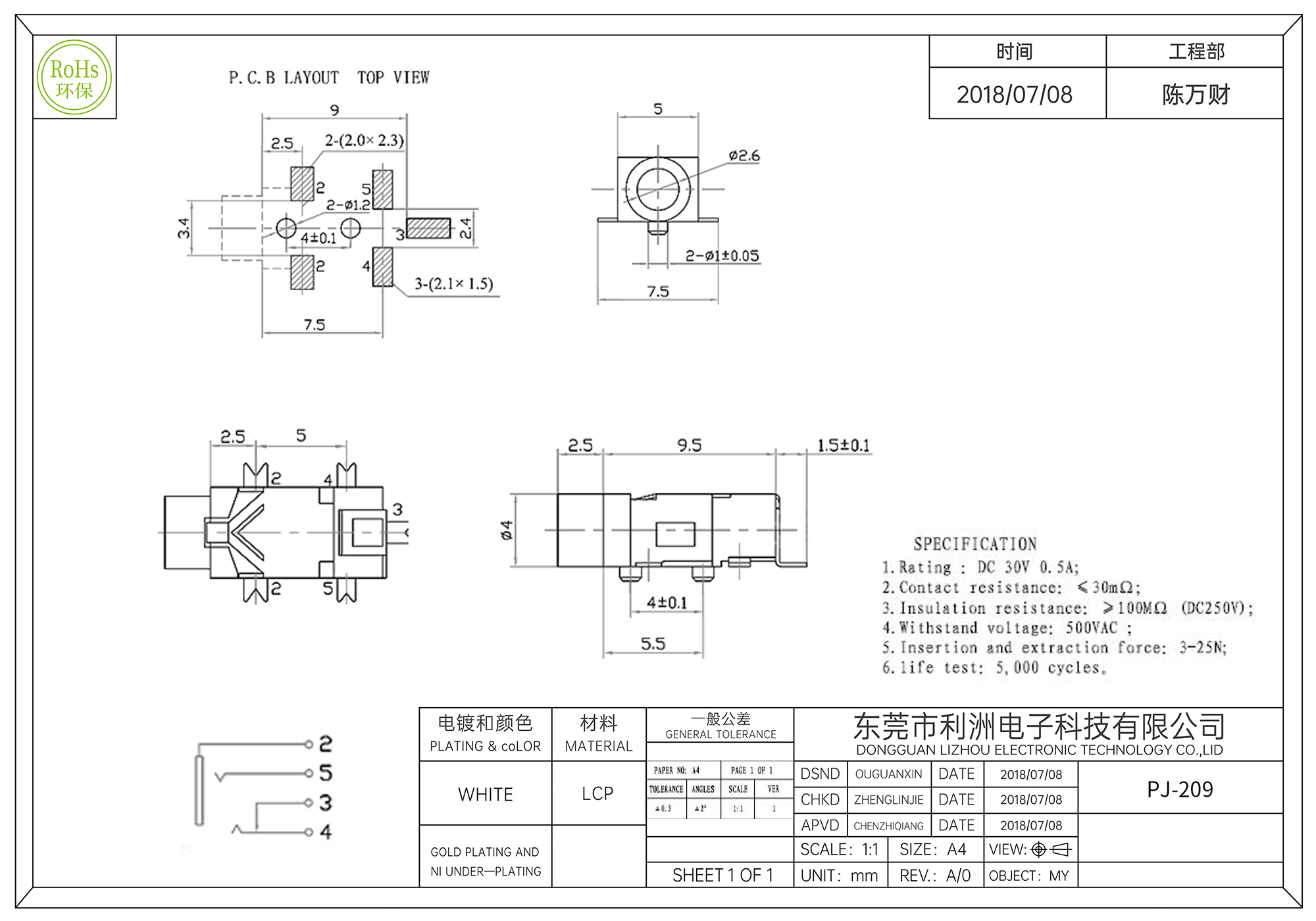 PJ-209耳机插座2.5mm五脚贴片镀金