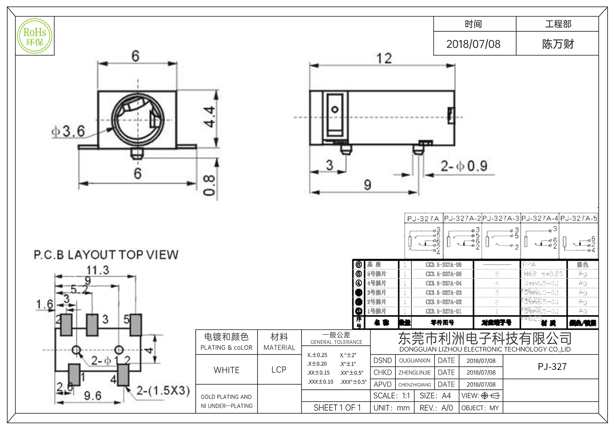 • PJ-327耳机插座3.5mm平头镀金五脚贴片