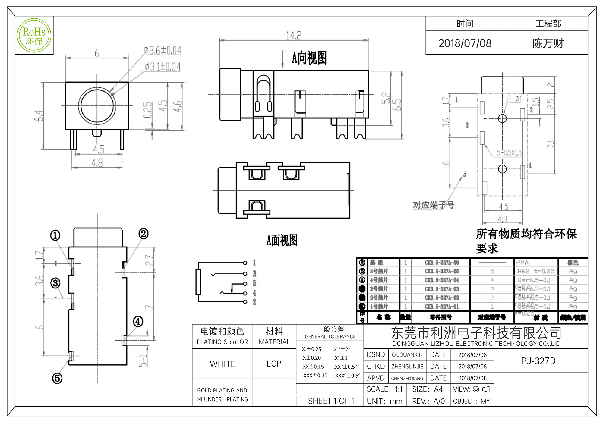 PJ-327D耳机插座3.5mm五脚插件镀金