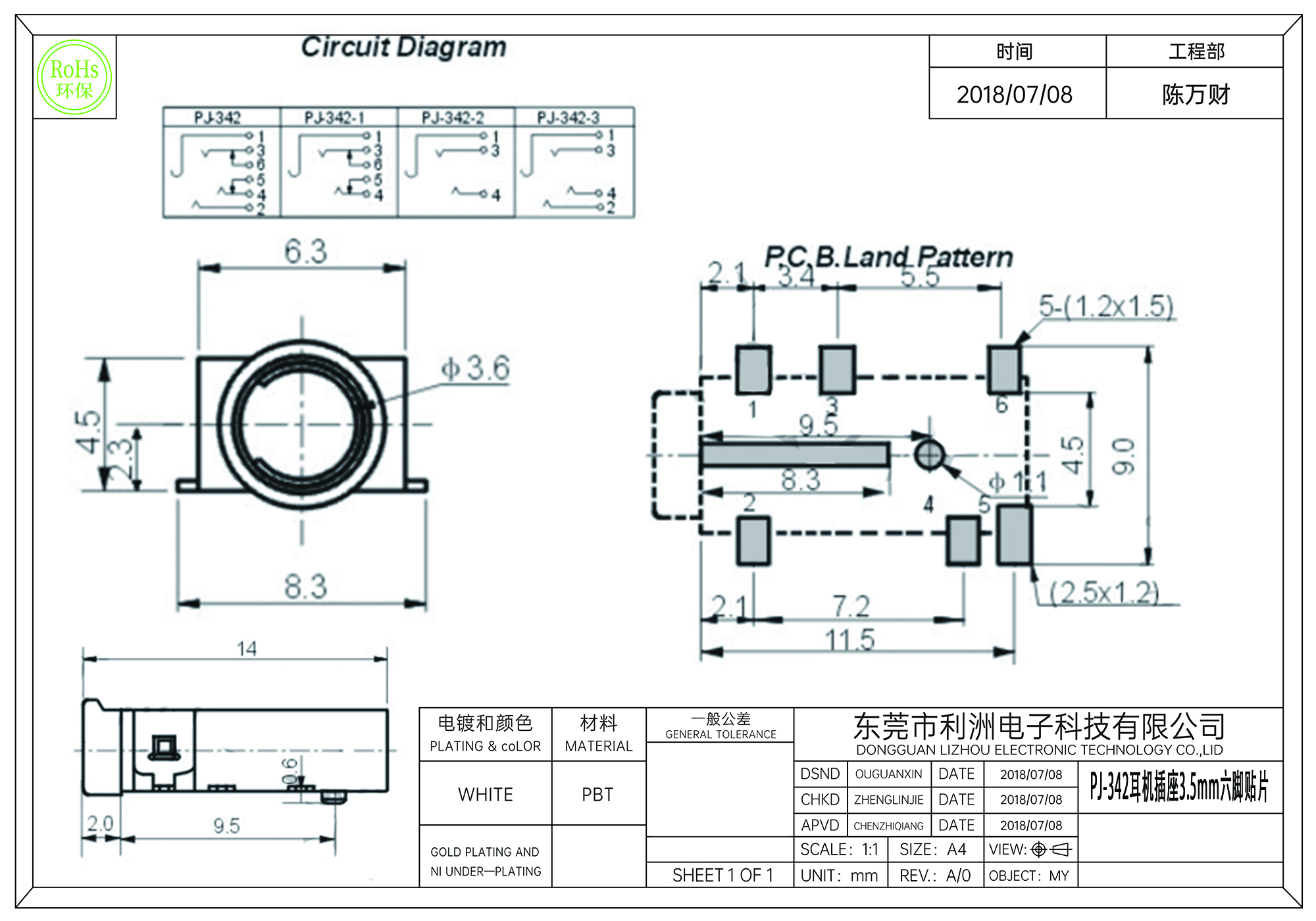 PJ-342耳机插座3.5mm六脚贴片