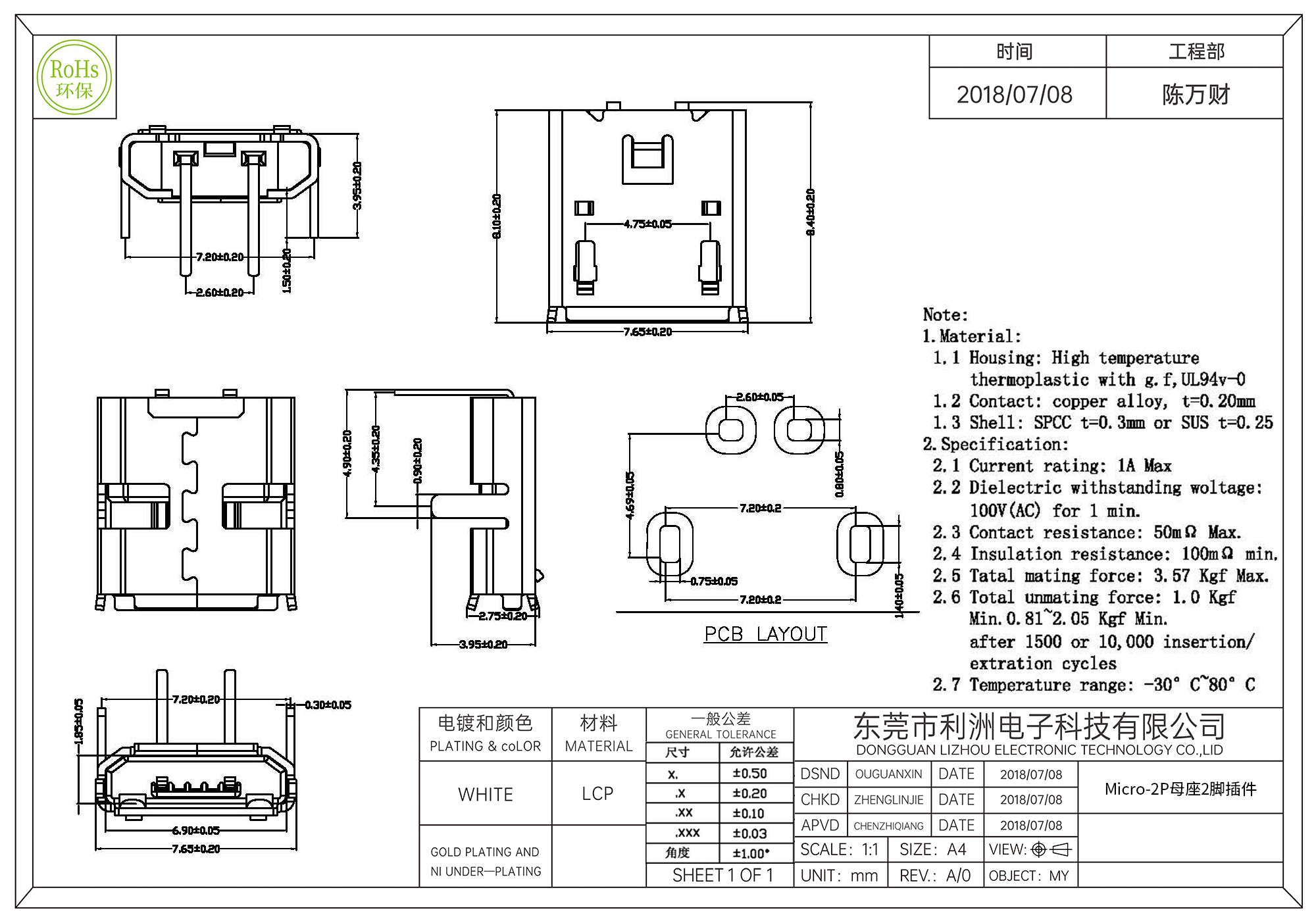 Total unmating force: 1.0Kgf min. 0.81~2.05 Kgf Min. after 1500or 10,000 insertion/extration cycles