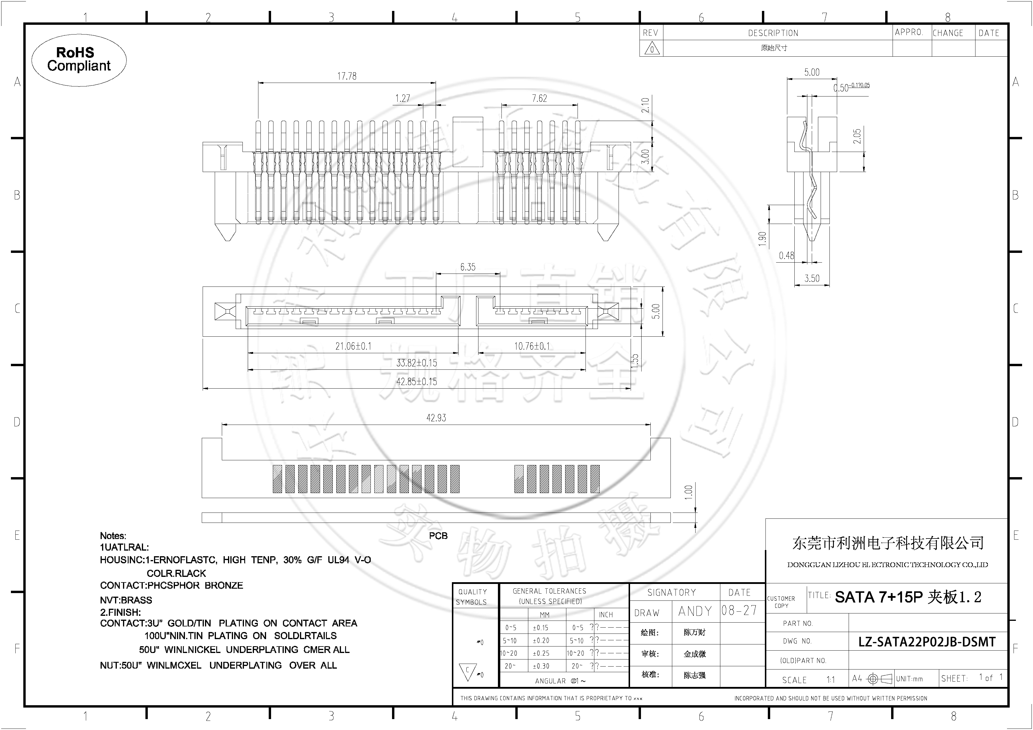 SATA7+15P 母座夹板 单面SMT
