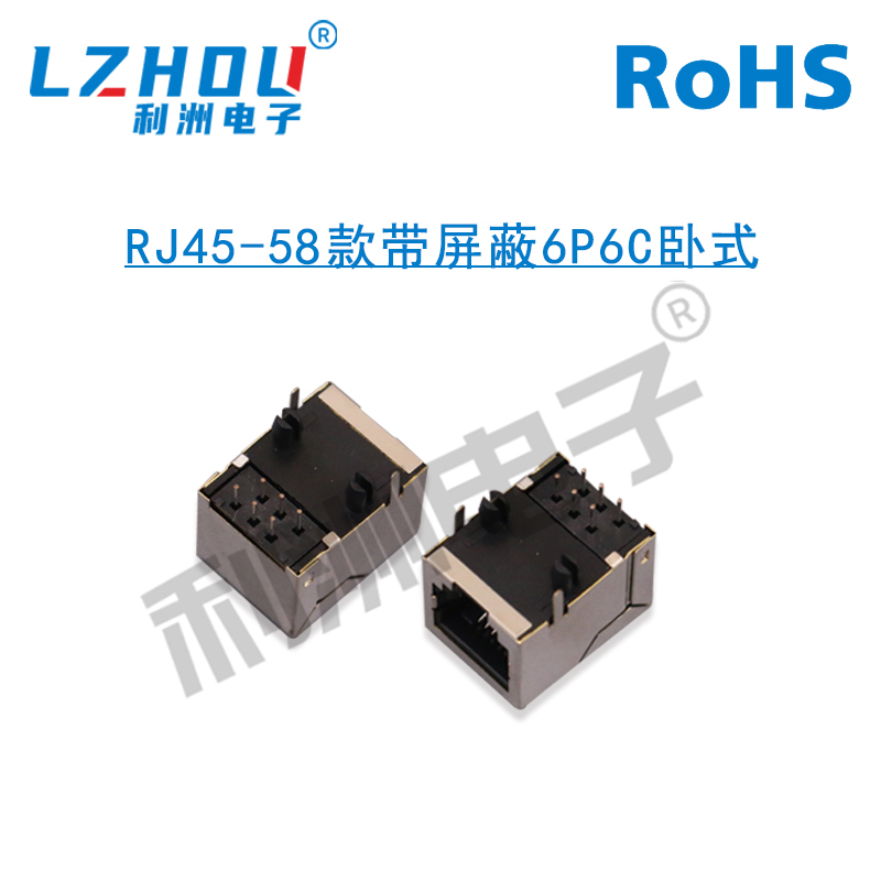 RJ45网络插座58款6P6C带屏蔽前二脚90度卧式插件网络插座接口插座